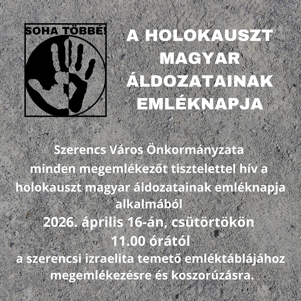 Szerencs Város Önkormányzata minden megemlékezőt tisztelettel hív a holokauszt magyar áldozatainak emléknapja alkalmából 2026. április 16-án, csütörtökön 11.00 órától a szerencsi izraelita temető emléktáblájához megemlékezésre és koszorúzásra.