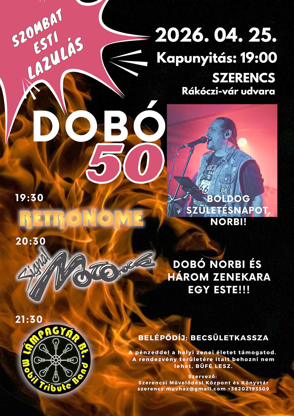 A szerencsi származású (ma már debreceni lakos) Dobó Norbi blues zenész és három zenekara lép fel Szerencsen 2026. április 25-én, szombaton a belső várudvaron.
