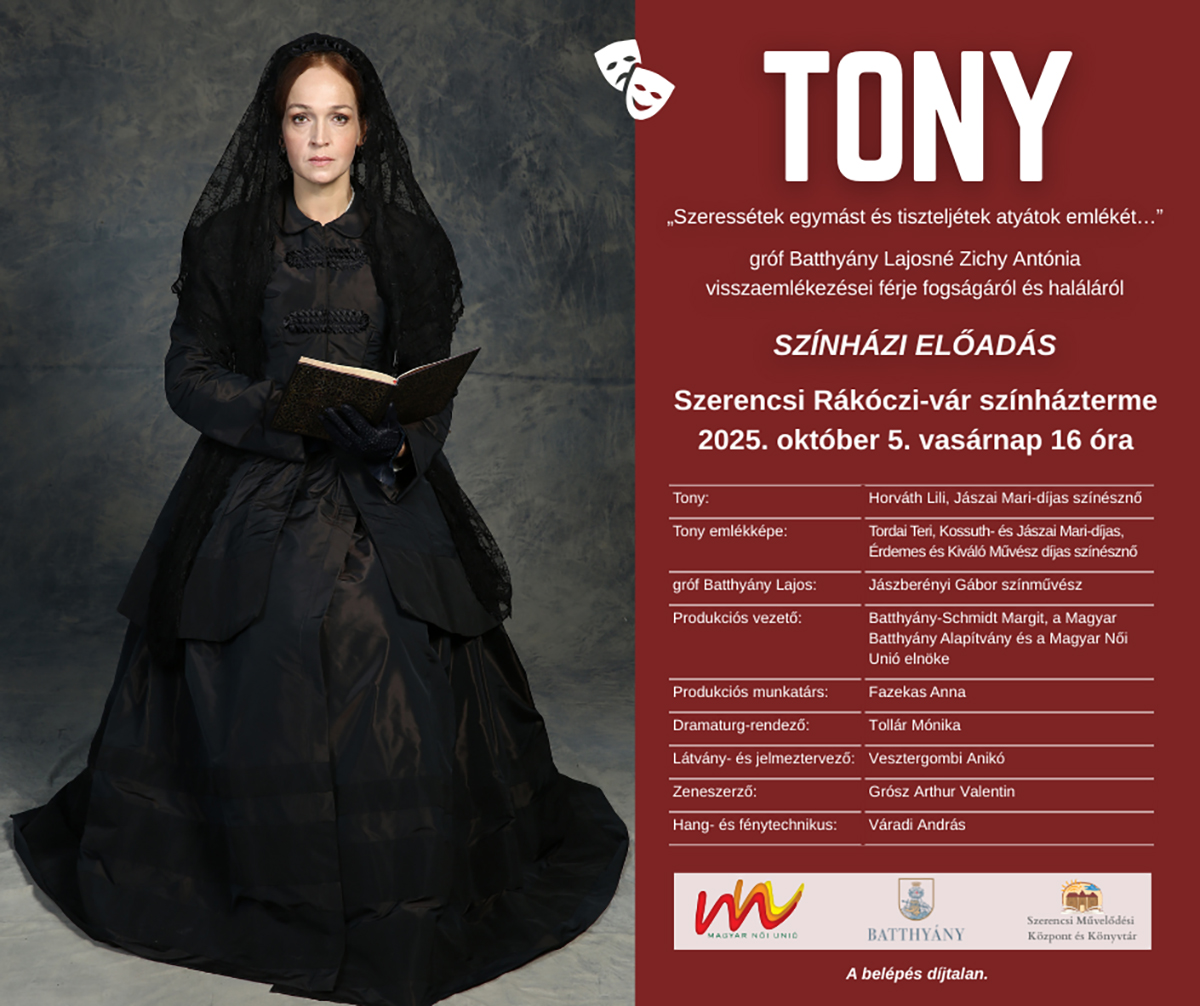 Október 5-én, vasárnap 16 órától a Rákóczi-vár színháztermében a Tony című előadás látható, mely gróf Batthyány Lajosné Zichy Antónia visszaemlékezéseiből készült.