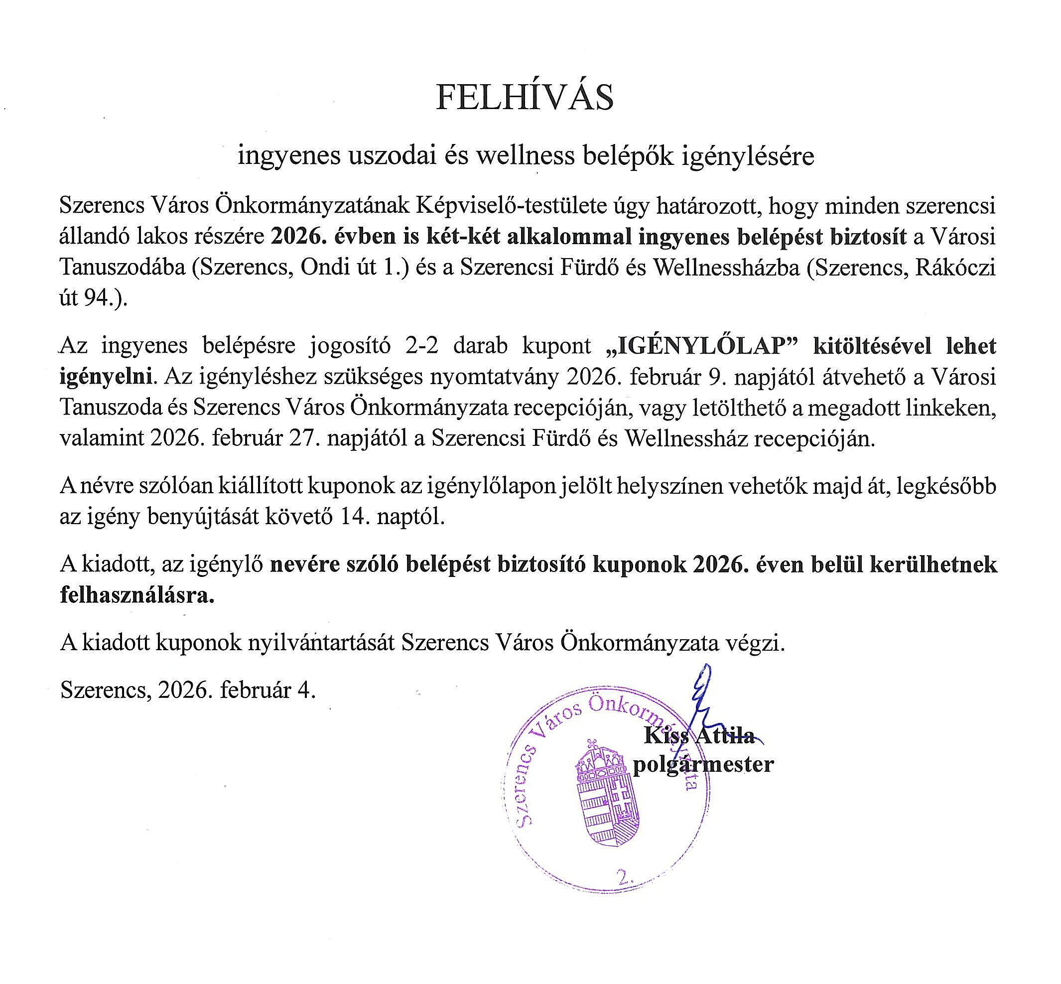 Felhívás ingyenes uszoda és wellnes belépők igénylésére